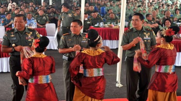 TRANSFORMASINEWS, PALEMBANG. Pangdam II Sriwijaya Mayjen TNI Bambang Budi Waluyo (kanan) bersama Kasdam II Sriwijaya Brigjen TNI Toto Moerasyad, diajak menari, pada acara perpisahan dan silaturahmi Pangdam II/Sriwijaya dengan prajurit dan PNS jajaran Kodam II Sriwijaya, Selasa (11/11/2014). Mayjen TNI Bambang Budi Waluyo akan mengakhiri masa jabatannya sebagai Pangdam II Sriwijaya yang selanjutnya akan menjabat penasihat Panglima TNI. Sumber:mSripoku