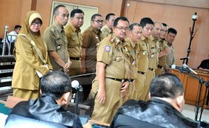 11 Camat se Kota Palembang ikut diperiksa sebagai saksi dalam kasus dugaan korupsi dana hibah Provinsi Sumsel tahun 2013, di Pengadilan Negeri Tipikor Palembang, Senin (29/5).– Foto Ferdinand Deffryansyah/koransn