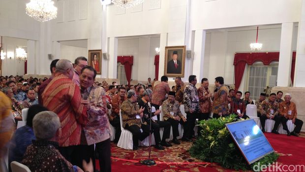 Dia meminta para kepala daerah mengukur komposisi ABPD untuk membandingkan belanja rutin dan belanja pembangunan. “Berapa persen belanja operasionalnya. Dilihat rutin dan itu yang memutuskan harusnya Bapak Ibu semua, jangan diberikan ke kepala dinas. Nanti yang terjadi adalah rutinitas, monoton,” ujar Jokowi. “Politik anggarannya itu ibu dan bapak yang pegang. Misalnya saya mau dikonsentrasikan ke pendidikan, ya sudah, konsentrasi di pendidikan. Jangan sampai anggarannya dibagi rata. Jangan lagi money follow function,” tambahnya. Para kepala daerah yang mengikuti pengarahan dari Presiden Jokowi dan Wapres Jusuf Kalla di Istana Negara, Jumat (8/4/2016). Foto: Ray Jordan/detikcom