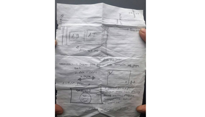 Bahkan, sisi sebaliknya dari kertas itu, terdapat sebuah sketsa, sebuah denah dengan empat penjuru mata angin. Lengkap dengan catatan detailnya. Disebutkan, dekat pos polisi ada kantin yang dijaga seorang perempuan, ada CCTV di pojok serta jumah polisi.