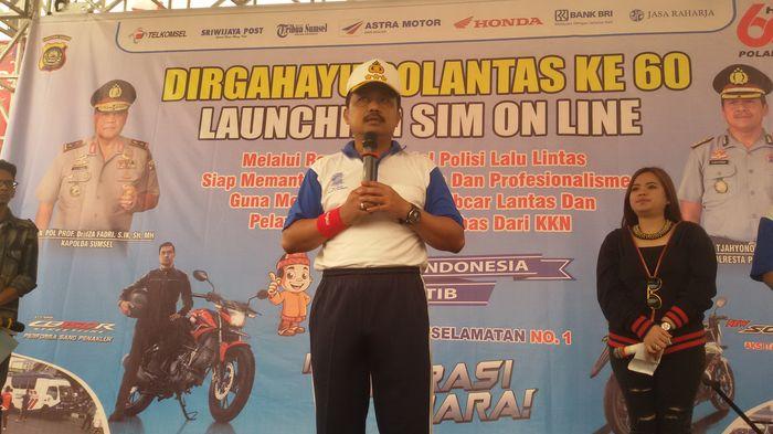 TRANSFORMASINEWS, PALEMBANG — Masih suasana perayaan HUT Polisi Lalu Lintas (Polantas) ke-60, Direktorat Lalu Lintas (Ditlantas) Polda Sumsel dan Satlantas Polresta Palembang melaksanakan launching SIM Online, Sabtu (27/9/2015) di Bundaran Air Mancur Palembang.