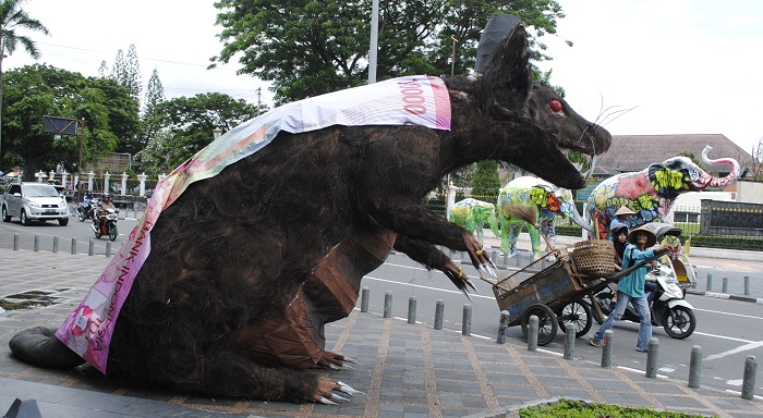 TRANSFORMASINEWS, YOGYA  – Pengguna jalan yang melintas di kawasan Titik Nol Km Kota Yogyakarta, Jumat (5/12), terperanjat. Pasalnya, di sudut taman ada tikus raksasa duduk menyeringai. Sang tikus pun menggendong lembaran besar uang 100 ribu rupiah. Meski diam tikus tampak hidup.