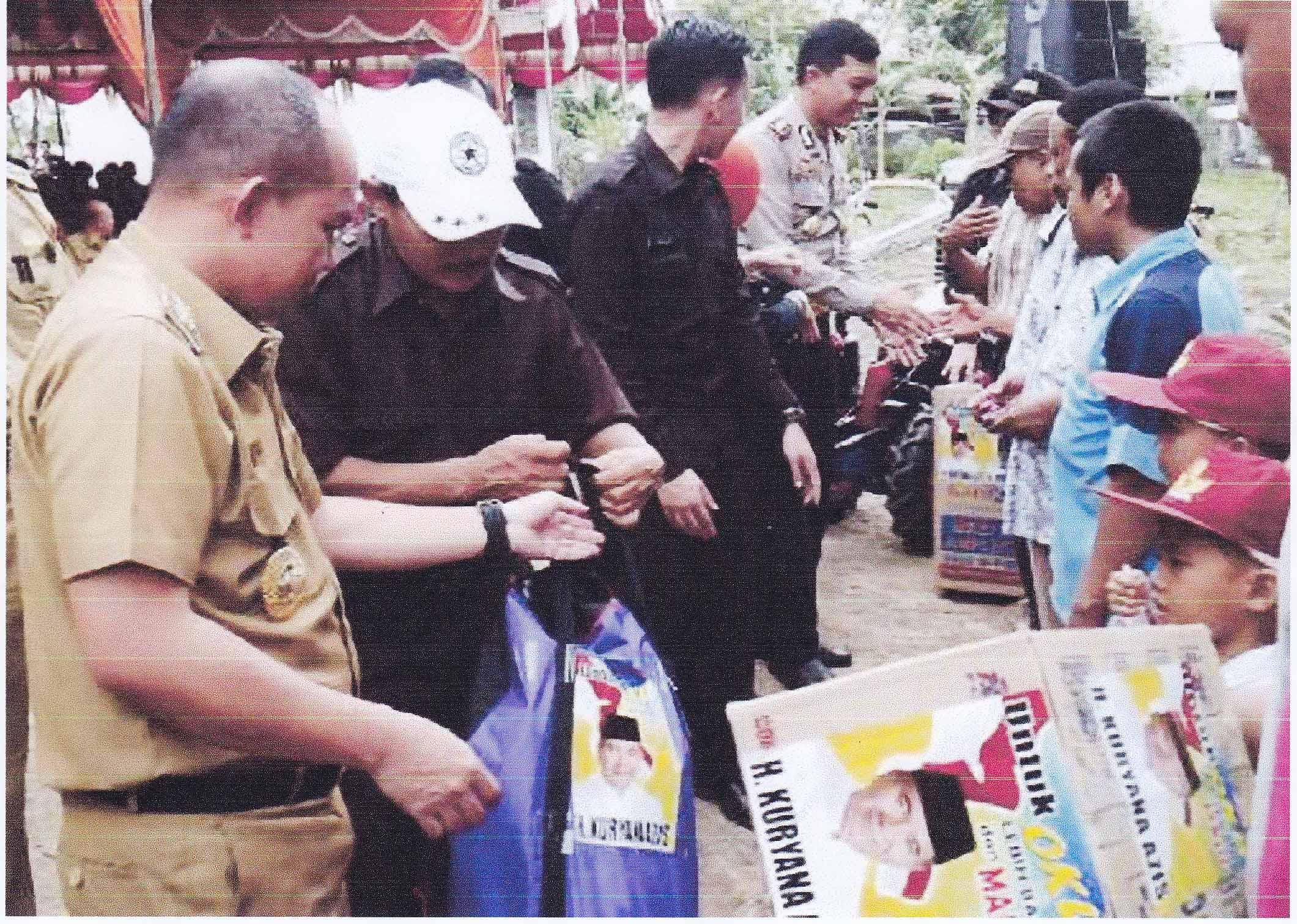 Tampak PJ.Bupati OKU, H.Maulana Akil yang biasa dipanggil dengan sebutan “Molen” dan hadir unsur Muspida juga tampak Kopolres Oku sedang menyalami warga yang mendapat bantuan, saat menyerahkan bantuan tampak sebuah kotak kardus dibalut dengan gambar paslon nomor satu Kuryana Azis-Johan Anwar dan tampak juga diduga kuat menyerahkan sebuah jaket atau rompi bergambarkan Paslon nomor satu Kuryana Azis-Johan kepada warga Sinar Peninjauan dan tampak anak sekolah juga hadir dalam acara tersbut, beberapa waktu lalu Pj.Bupati melarang PNS ikut terlibat dalam dukung mendukung salah satu Paslon pilkada PNS Harus Netral, ternyata tampak difoto dengan jelas diduga kuat sedang memberikan sumbangan. Secara kasad mata masyarakat jelas mengatakan keberpihakan Molen ke poslon nomor satu, Ketua LSM-INDOMAN Ir.Amrizal Aroni, M.Si Bidang Politik dan Demokratisasi sudah melaporkan ke Mentri Dalam Negeri Cq. Seketaris Jendral Depdagri Pak.Yuswandi yang juga merangkap Ketua Netralitas PNS Dalam pelaksanaan Pilkada Serentak se Indonesia pada 9 Desember mendatan. Foto: (24/11/2015) Istimewa/Transformasinews.comJANJI KELAR: Pemerintahan Kabupaten OKU dan OKU Timur berkomitmen sebelum pilkada 2015 digelar tapalbatas antar kedua daerah ini kelar alias rampumpung. Tampak PJ.Bupati OKU, H.Maulana Akil, menyerahkan bantuan alat pertanian kepada warga Sinar Peninjauan, kemarin (24/11/2015). Foto:IST/Oku Ekspres. Foto tersebut terbit di koran oku ekspres tanggal. 25/11/2015 dengan Judul Tapal Batas, Kelar Sebelum Pilkada.Tampak sepanduk terpasang di depan Kantor kepala Desa Tanjung Makmur Kecamatan Sinar Peninjauan Kabupaten Ogan Komering Olu, di lokasi tersebut tempat pusat acara resmi Pemda Oku untuk menyerahkan Bantuan alat pertanian, juga diduga keras dimanfaatkan untuk kegiatan sunatan masal dan KB Gratis oleh pasangan Paslon Kuryana Aziz – Johan Anuar. Tempat lokasi yang sama Pj.Bupati Oku H.Maulana Akil secara resmi hadir beserta unsur Muspida. Foto: Istimewa/Transformasinews.com