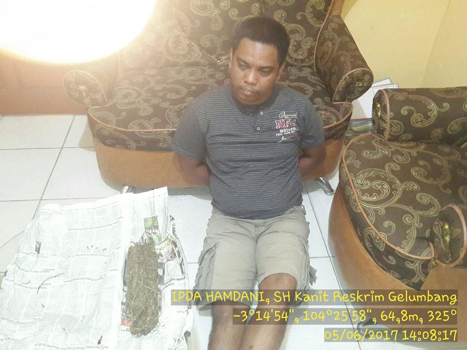 TRANSFORMASINEWS.COM, MUARA ENIM. F (32) warga Desa Sukarami Kecamatan Sungai Rotan, Kabupaten Muara Enim digelandang kanit Reskrim Polsek Gelumbang pada saat akan melakukan transaksi penjualan Narkotika Jenis Ganja, Senin (05/06/2017) pukul 14.00 wib.