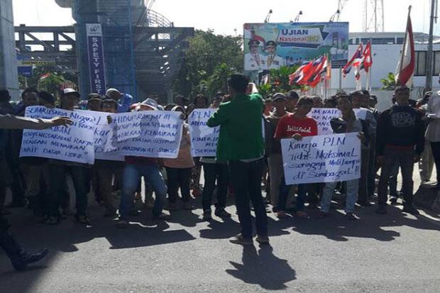 Kantor PT PLN (Persero) WS2JB di Jalan Kapten A Riva’I didemo puluhan orang yang tergabung dalam LSM Penegak Keadilan, Senin (8/5/2017).Koran SINDO/Agus Rizal